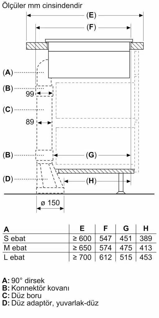 Isıtma elemanlarının boyutları (gaz için geçerli değildir)